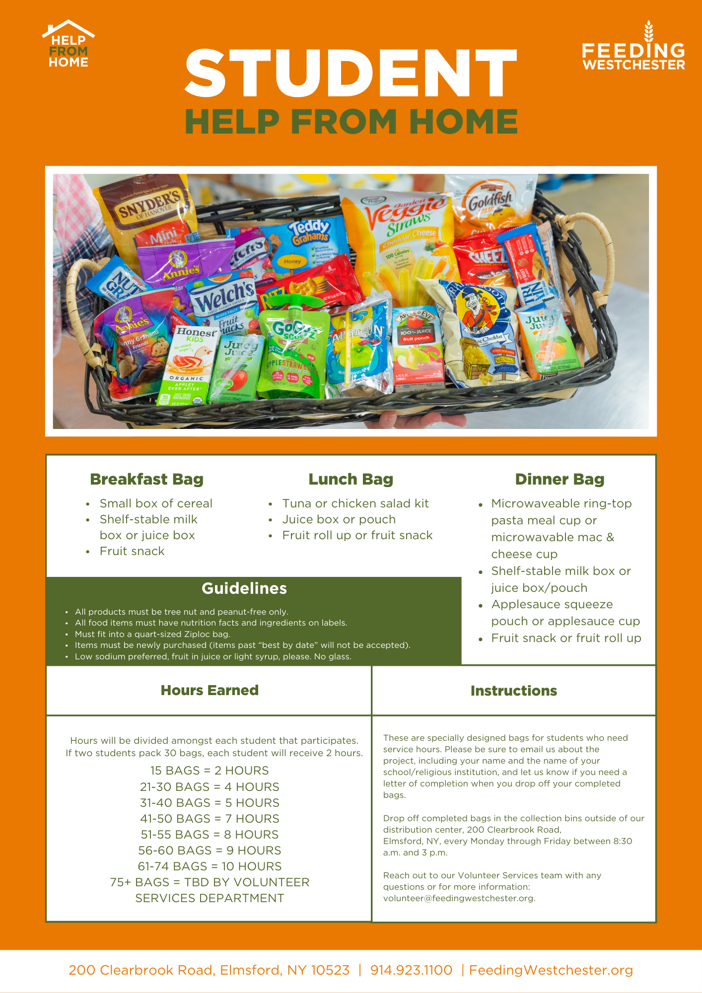 Drop off completed bags in the collection bins outside of our distribution center, 200 Clearbrook Road, Elmsford, NY, every Monday through Friday between 8:30 a.m. and 3 p.m. Reach out to Director of Volunteer Services, Jandery DeLaCruz, at jdelacruz@feedingwestchester.org for more information.